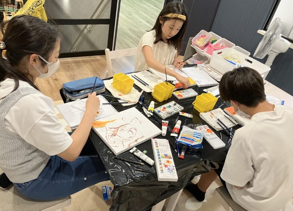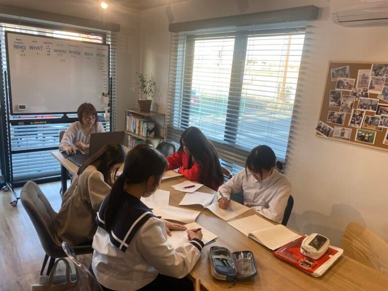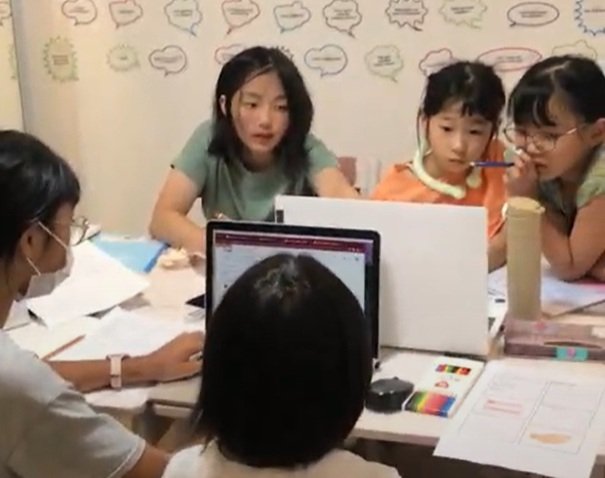 In this class, students are fully engaged in their English learning. Working together around the table, they practice writing, reading, and sharing ideas while receiving guidance from their teacher. The warm, home-like classroom creates a focused yet relaxed atmosphere where learners can concentrate and enjoy studying.