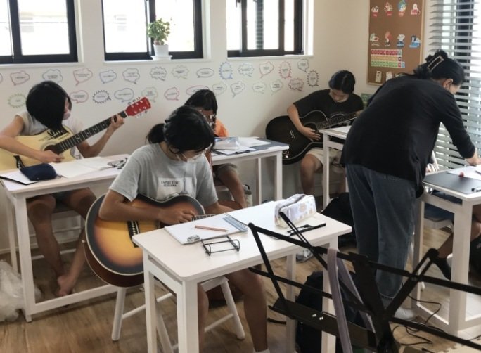 Students enjoy a lively classroom session where they practice playing the guitar while learning in English. Guided by their teacher, they combine music with language, reading notes, following instructions, and expressing themselves through both sound and words. This creative activity helps students build vocabulary, listening, and communication skills, while boosting confidence in a fun and engaging atmosphere.