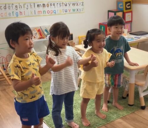 Children learn English through songs and rhythm, engaging their whole bodies as they move and play. By linking words with actions, they naturally develop listening skills, pronunciation, and a sense of rhythm, while also building confidence and teamwork. In a fun and lively atmosphere, English becomes an enjoyable, play-like experience.