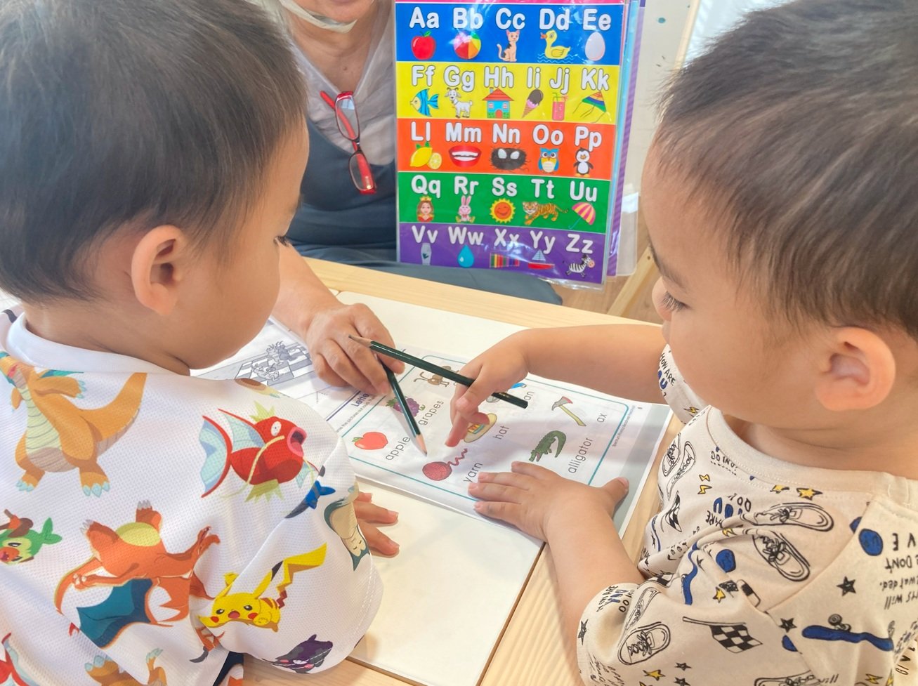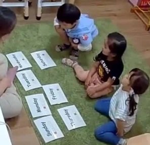 Children use colorful picture cards and alphabet charts to learn English words through play. With familiar vocabulary such as “apple” and “hat,” they naturally acquire new words by pointing, practicing pronunciation, and repeating. These enjoyable activities help children gain confidence in English and develop a genuine interest in learning the language.
