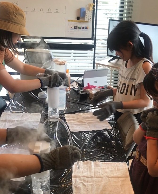 Students take part in a hands-on science activity, experimenting with materials that create steam and excitement. Wearing protective gloves, they carefully observe, measure, and explore while following instructions and discussions in English. Through this interactive lesson, children not only enjoy STEM learning but also build new science-related vocabulary, making education both practical and fun.